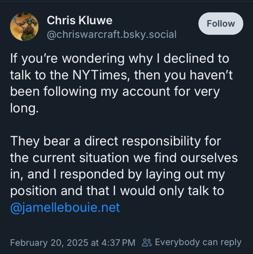 - Chris Kluwe first called MAGA 'a Nazi movement' in protest that led to his arrest; then he declined to comment to the New York Times because he holds them responsible for their part in getting us to this state of affairs. Video of Kluwe speaking up here. His statement regarding the NYT screenshot from Bluesky below. (Jamelle Bouie is the NYT columnist Kluwe was willing to speak to. Bouie is excellent.)