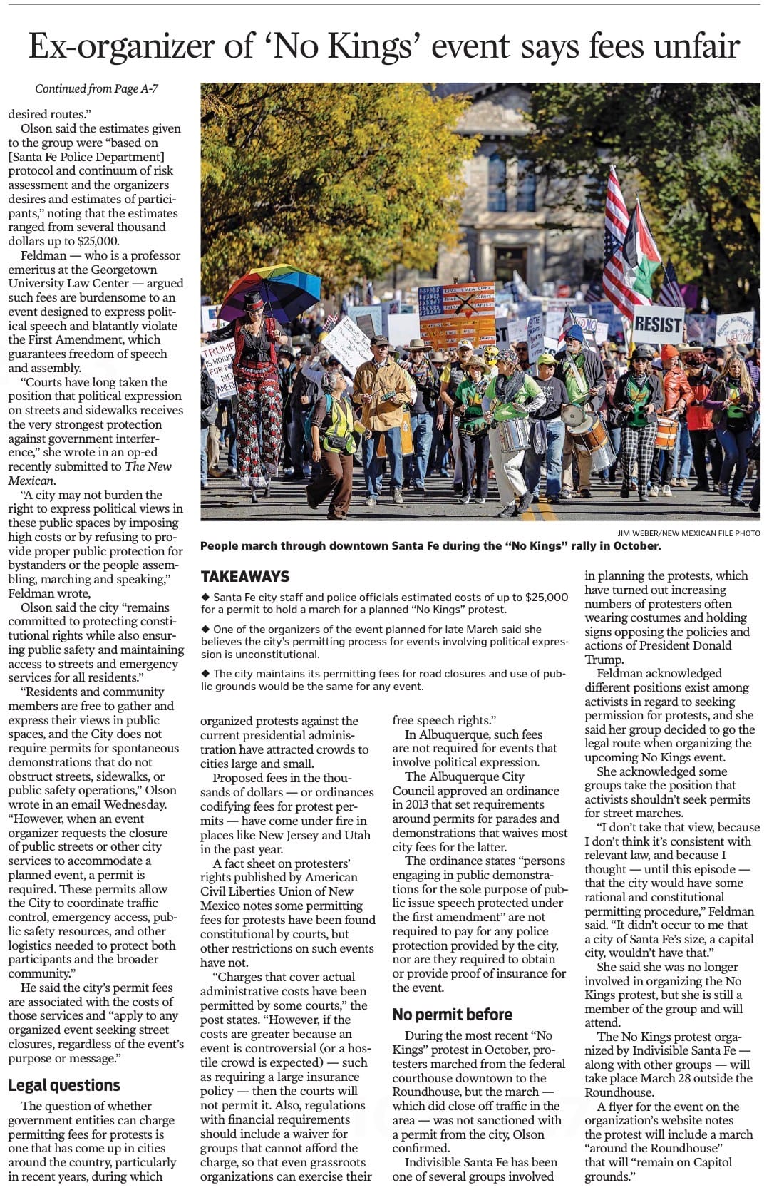 12 Mar 2026 The Santa Fe New Mexican covers First Amendment problems re No Kings 3 If folks in small cities and town can’t assemble and protest Republican Fascism, the U.S. will never be rid of it.The above story appears online here.
